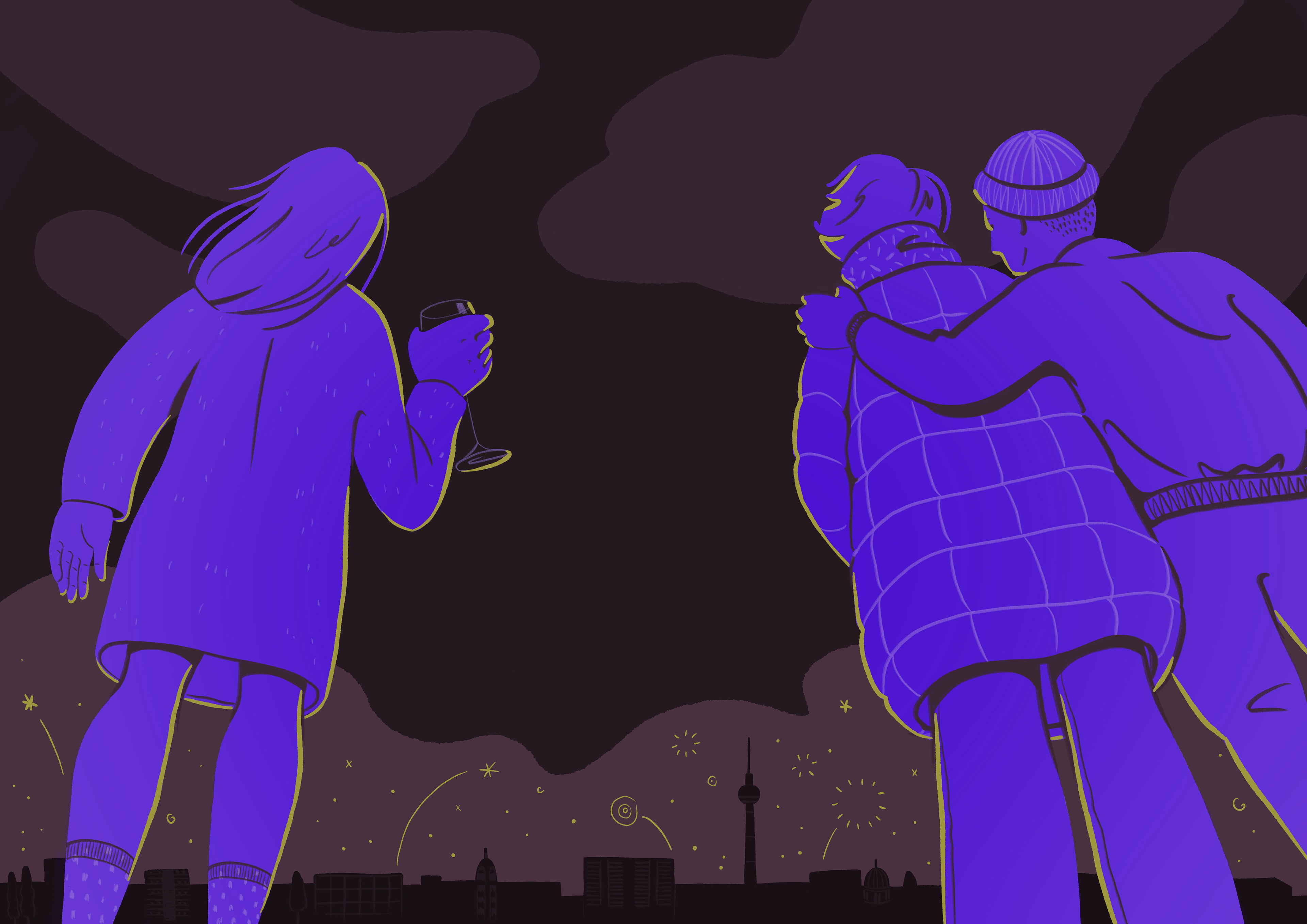 Personal illustration about starting the new year on a rooftop in Berlin, surrounded by friends.